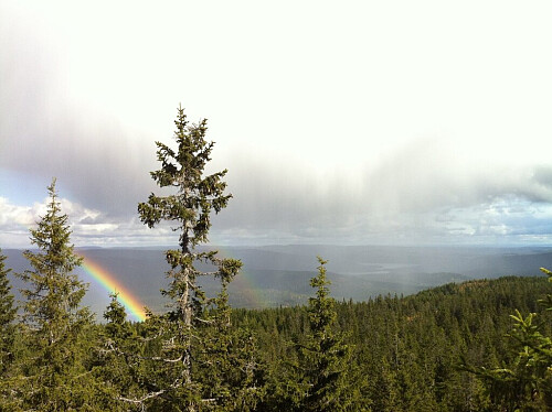 En regnbue og en regnbyge dominerer utsikten fra toppen av tårnet på Oppkuven mot Vesle og Store Sandungen. Da vi kikket den andre veien så vi solskinn. Tårnet har fått ny trapp og er beæret med en kjentmannspost for perioden 2012-14.
