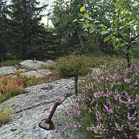 Disse metallinnretningene må ha vært festene til et forlengst forsvunnet trig.punkt. I dag er det tårnet i bakgrunnen som er landemerke på Oslomarkas høyeste topp, Svarttjernshøgda.