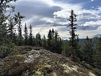 Etter besøket på Langemyrfjellet kjørte jeg tilbake igjen et stykke og tok av opp mot Sjugurdsetre mellom Sauflag og Gråskallen. Jeg parkerte på snuplassen og gikk ned til der hvor stien innover langs foten av Sauflag starter. Stien/traktorveien var bred og lettgått, skråningen opp mot Sauflag så ikke så innbydende ut! Da jeg var på høyde med Nordseter tok jeg ut av stien og bega meg oppover lia. Det var bratt og ulendt, men det gikk likevel overraskende greit å komme opp til platået i 650 meters høyde. Her ble det litt bushing før jeg fant et svakt tråkk som jeg kunne følge videre helt opp til SØ-toppen. Dette tråkket fulgte jeg også på tur ned, og det kan følges helt ned til traktorveien omtrent 50 meter nord for der hvor jeg gikk opp lia fra.