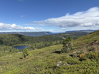 Neste stopp på denne turdagen var Saulifjellet. Fra Øyvatnet var det ikke lange kjøreturen til avkjøringen opp fra hovedveien. Avkjøringen var skiltet med privat vei, så jeg valgte å parkere i en lomme ved hovedveien. På tur oppover mot hyttefeltet innså jeg etterpå at jeg hadde vært litt vel defensiv med tanke på parkeringen og kunne absolutt kjørt helt inn til hytta innerst langs vegen. Fra enden av veien fulgte jeg en sti over bekken og fulgte så denne et stykke oppover før den dreide videre retning Saulifjellet. Det var god utsikt mot øst langs hele oppstigningen til skaret nord for toppen. Her ble gradvis stien borte, men likevel enkelt terreng å følge videre frem til toppen. Saulifjellet reiser seg litt over det grønne og frodige terrenget rundt, og her kan man absolutt >>>