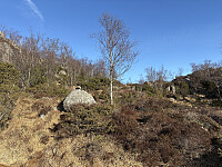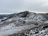 Det var litt vanskelig å finne en egnet plass langs hovedveien, så jeg parkerte i en lomme langs Madlandsvegen. Herfra bar det rett oppover i en bratt steinur slik at jeg kom opp nord for Forefjellet. Ruta videre mot toppen gikk langs diverse tråkk/gjengrodde stier innover dalen og opp mot toppen. Litt nysnø i terrenget, men ikke mer enn at det gikk helt fint å gå til fots. Vid utsikt fra toppen men litt grått og overskyet denne dagen.