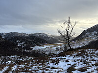 Mellom Svihusvatnet og Seldalsvatnet går det en gårdsvei opp til Nordland gård. Jeg kjørte omtrent halvveis opp til gården og parkerte i en lomme langs veien. Herfra fulgte jeg gårdsvei og traktorvei helt frem til jeg var rett sør for Kjerringfjellet. De siste 200 meterne måtte jeg ut i terrenget i litt utydelig underlag da det hadde lagt seg et lag med nysnø i området. Tok det derfor ganske pent på turen videre, hadde ikke noe ønske om å tråkke over! Fra Kjerringfjellet fikk jeg god oversikt over ruta videre. Først ned til og opp på Pigfjellet som ligger like ved. Her ble det litt lett klyving, kanskje mest pga det glatte underlaget. Videre østover til Nordra Stølsfjellet, fremdeles uten synlige stier i området. Nå ble kursen dreid sørover retning Askenuten. Endelig kom >>>