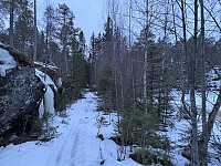 Jeg fulgte merket sti/scooterløype hele veien opp til toppen. Det kan være at løypa går en noe annen vei sommerstid, spesielt over myrområdene nedenfor Liahøgda. Denne dagen var det såpass mye snø at jeg valgte å følge scootersporene så langt som det lot seg gjøre, da var jeg bare et par hundre meter unna toppen. Jeg nådde toppen akkurat før det ble helt mørkt, og kunne nyte utsikten retning Stjørdal i SV "by night". Retur i samme spor. Hodelykta var med, men jeg slapp å bruke den:)