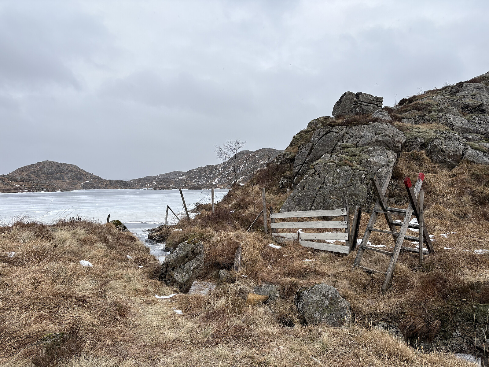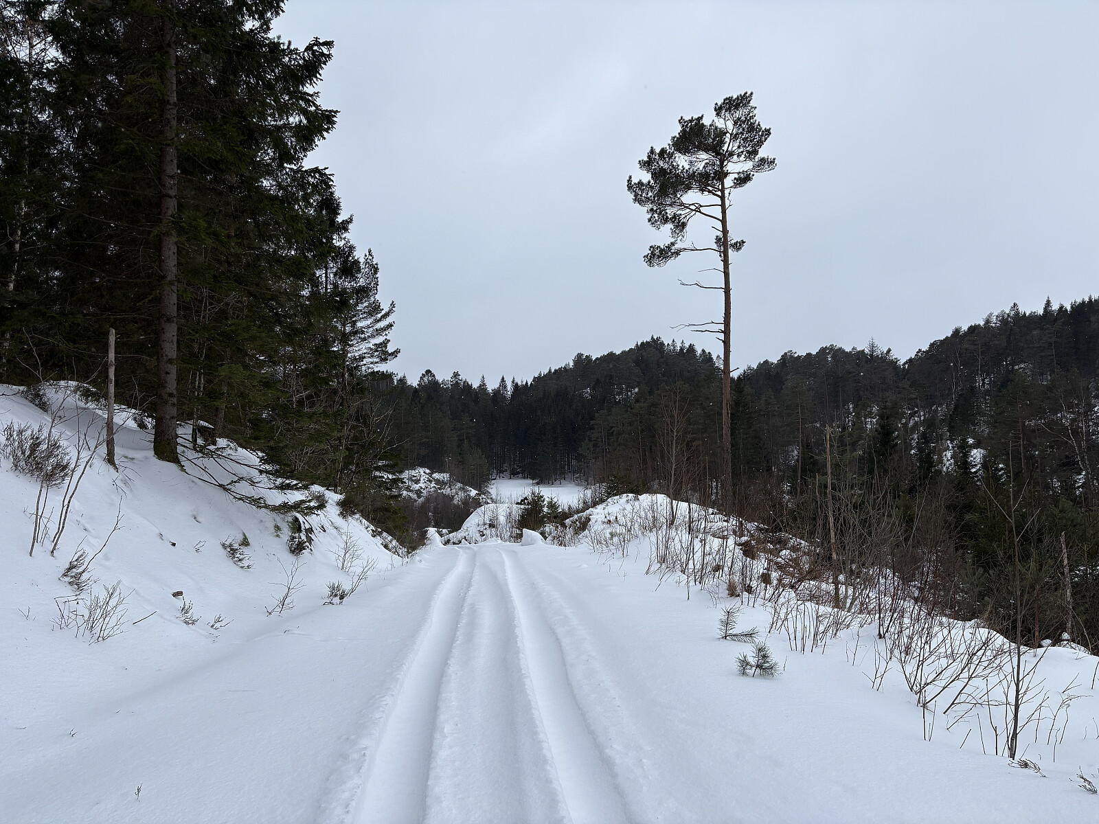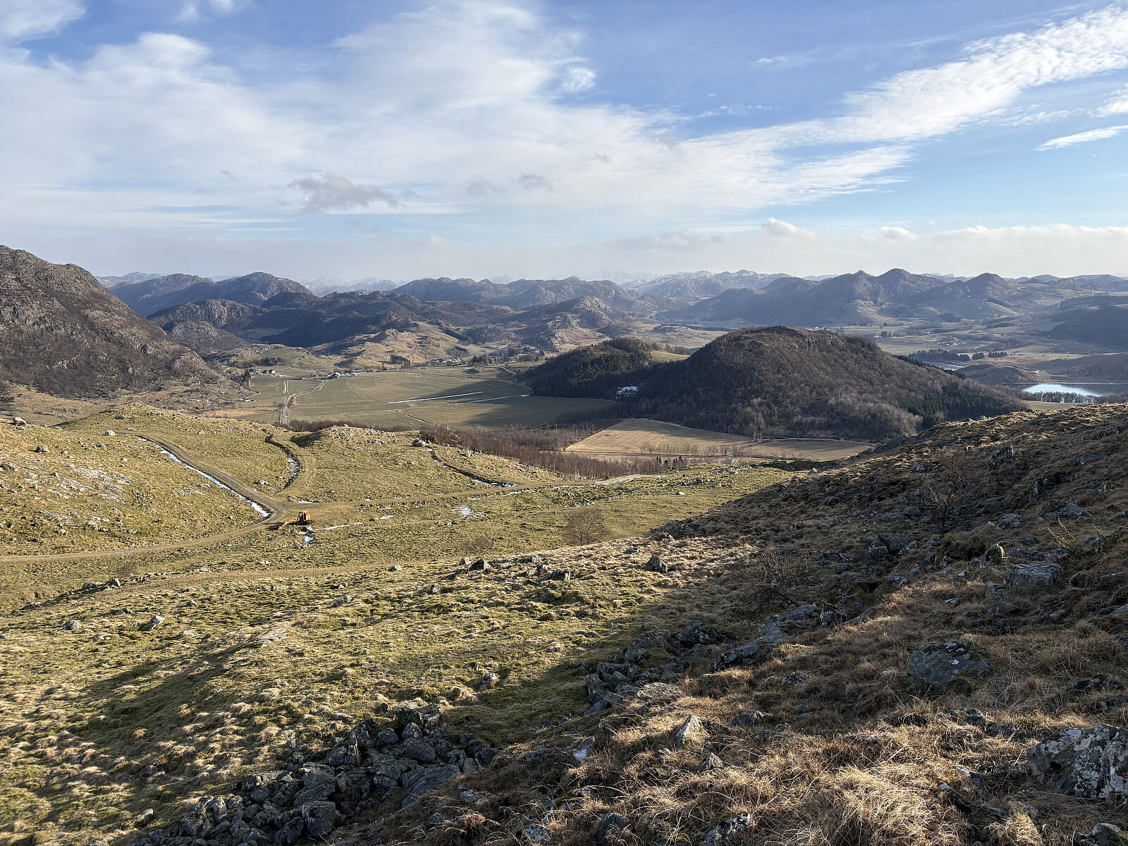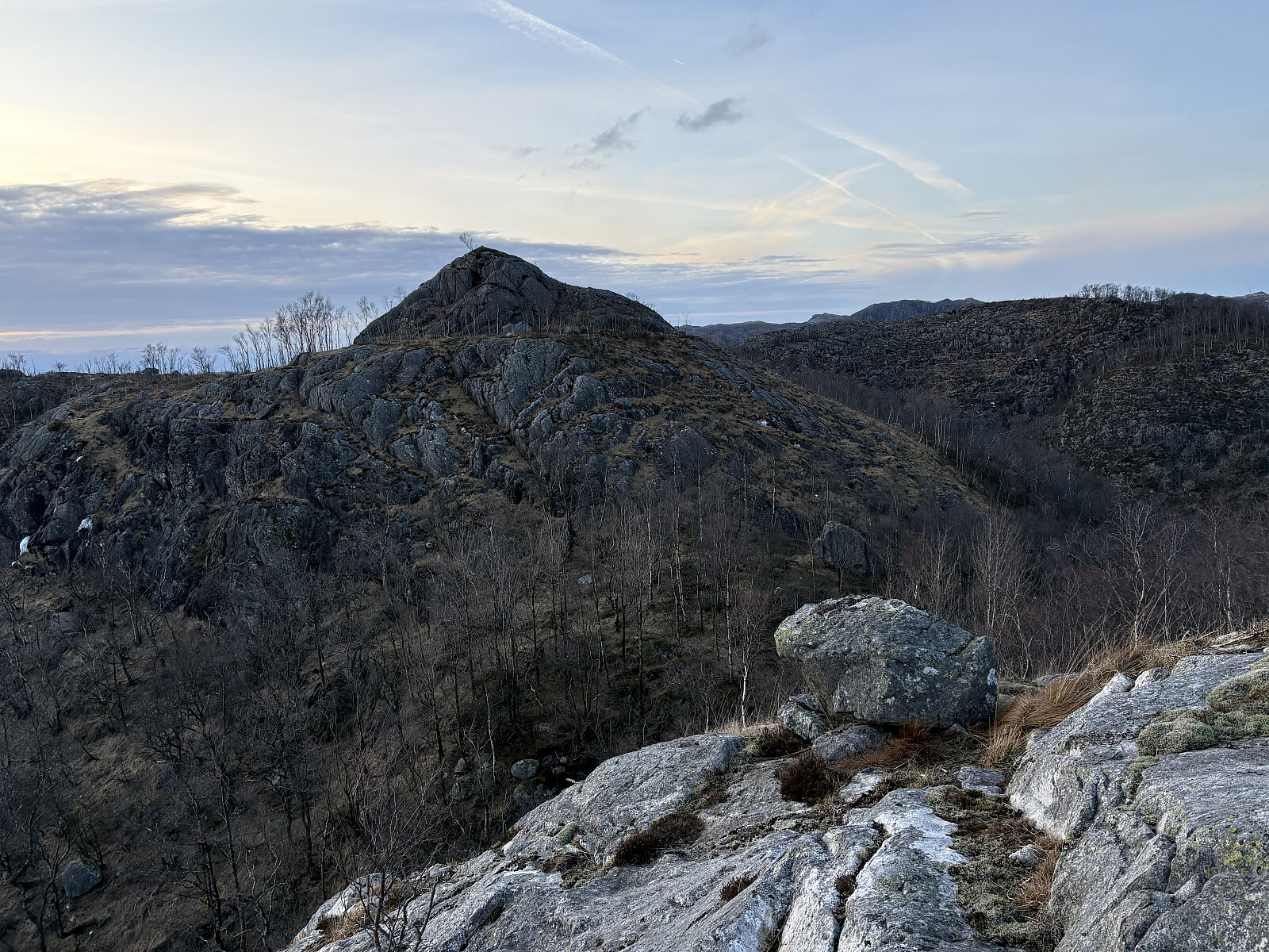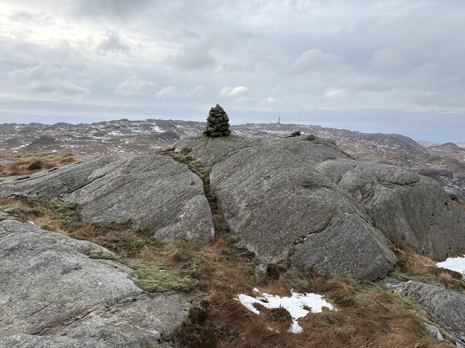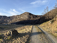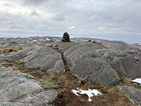 Jeg parkerte i en lomme langs Kristiansandveien der hvor en stikkvei retning toppen går sørover. Etter å ha kommet forbi bolighuset fulgte jeg et traktorspor videre inn til snuplassen. Det var overraskende mye snø i terrenget og ekstra mye ble det fra snuplassen og opp til toppen hvor det ikke var noe slags spor å følge. Underveis opp mot toppen ble det etter hvert vid utsikt nordover. På selve toppkollen var det bart berg og en liten varde. Noe utsikt herfra.