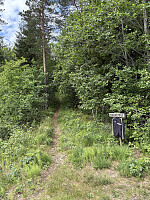 Sykkelen ble funnet frem og så var det bare å tråkke seg innover mot Holtehedde og Høymyrpynt. Jeg passerte Støvland og syklet opp til bakketoppen sør for Høymyrpynt. Her satte jeg fra meg sykkelen og fortsatte videre ned bakken til fots. Her var det skiltet til Holtehedde og jeg fulgte merket sti opp til toppen. En bar og fin kolle med skilt, turpostkasse og varde, men ingen utsikt. Jeg gikk samme vei ned igjen og inn på en sterkt gjengrodd sti retning Lindevannet. Denne stien var ikke noe å skryte av, og jeg fant ut at jeg like godt kunne begi meg rett opp lia mot toppen av Høymyrpynt først som sist. >>>