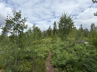 Sykkelen ble funnet frem og så var det bare å tråkke seg innover mot Holtehedde og Høymyrpynt. Jeg passerte Støvland og syklet opp til bakketoppen sør for Høymyrpynt. Her satte jeg fra meg sykkelen og fortsatte videre ned bakken til fots. Her var det skiltet til Holtehedde og jeg fulgte merket sti opp til toppen. En bar og fin kolle med skilt, turpostkasse og varde, men ingen utsikt. Jeg gikk samme vei ned igjen og inn på en sterkt gjengrodd sti retning Lindevannet. Denne stien var ikke noe å skryte av, og jeg fant ut at jeg like godt kunne begi meg rett opp lia mot toppen av Høymyrpynt først som sist. >>>
