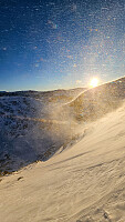 Episk tur i heftig vær (vedvarende middelvind (15-20m/s) vindkast (25-30m/s) effektiv temp (-30c)). Artig rutevalg og utforsking av Hjellbønebba S1 som høydepunkt, ukjent om noen har vært der før? Spennende nedkjøring i renna ned Jønnstadkollen (40-45 grader) i nullsikt og voldsom medvind!