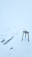 Voldsom motvind hele veien (24-28m/s), litt eksamen i vinter/kuldedisiplin (-32c effektive), god ansiktsbeskyttelse, rask tur, piggentur nr 100, sto i hockey ned breen - umulig å se/kjenne forskjellen mellom om jeg hadde fart på 5km/h eller 50km/h (total whiteout), plutselig nede så det gikk sikkert fort!