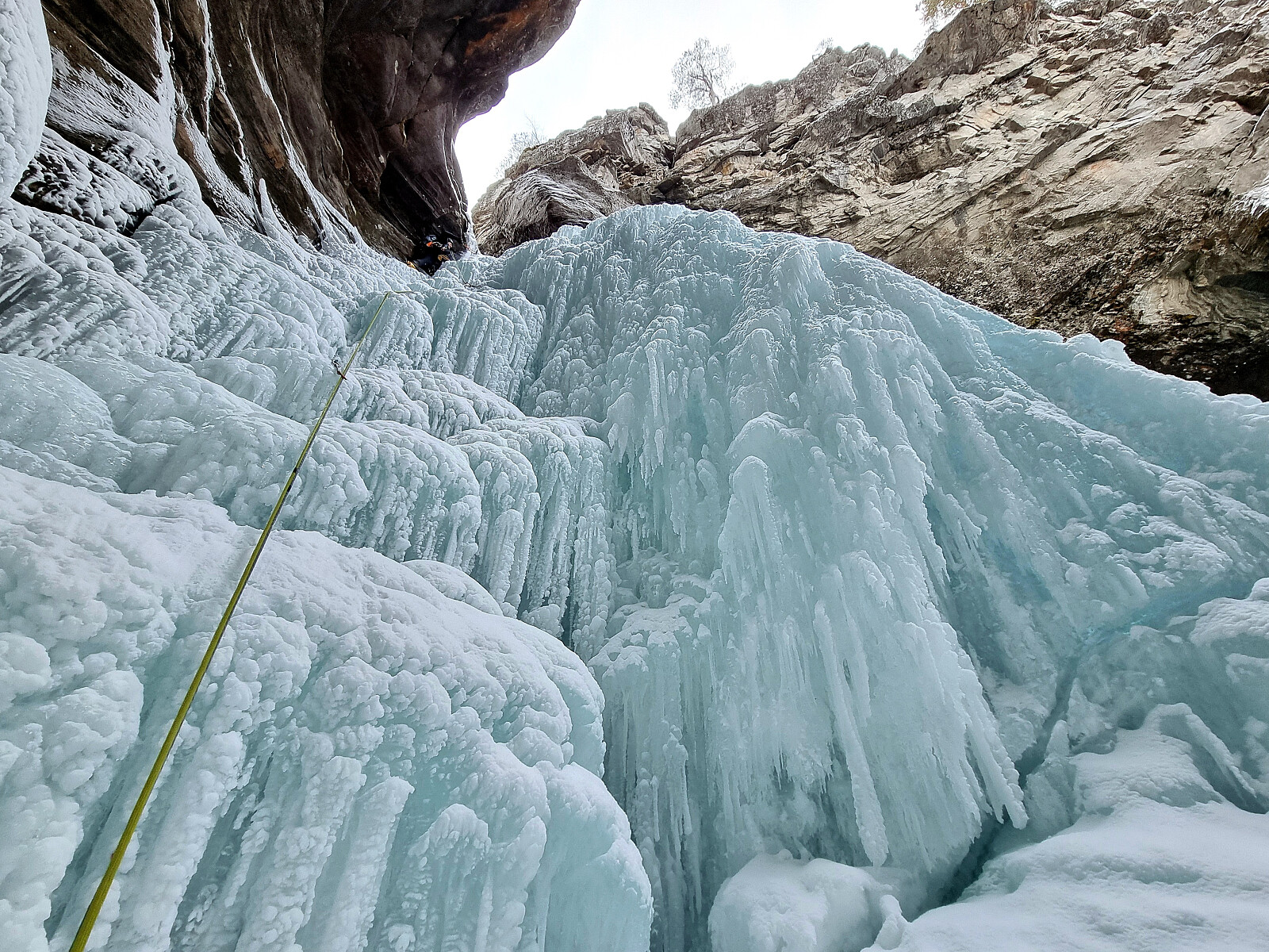 Vel tilbake ved brua tok vi på sele, hjelm og stegjern. Elva Tundre hadde frosset ganske bra til, men enkelte steder var det tynn is man kunne tråkke gjennom, så vær obs. Det er ikke hvert år det er mulig å isvandre opp her, men i år hadde det vært kaldt over lenger tid. Første opptak er 15 meter (WI2+). Deretter vandring et stykke før elva snevrer seg inn ved en stor kulp med overheng. I neste kulp var det åpent vann der vi ikke kom oss forbi. Løste det ved å gå litt tilbake >>>
