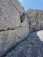 Våren har vært helt fantastisk, og det er lett å bli bortskjemt når været har vært så bra. Da gjelder det å gi seg selv et spark i ræva og minne seg på at det er nå man har muligheten til å dra ut på eventyr! Etter et par uker med ferie fra fjelljobbing har jeg begynt å finne tilbake turappetitten igjen. Snakket med David under en sportsklatretur i Stryn forrige helg om muligheten for å stikke til Hurrungane til uka og klatre i sola. Han var gira, og vi satte av onsdagen til tur. Målet var å klatre ”Sørveggen via Ny tid” (nr 34 i føreren for Jotunheimen), en åtte taulengder lang rute med et off-width crux på grad 7. Takk til Sigurd for lån av #5 camalot som visstnok skal være nyttig her.