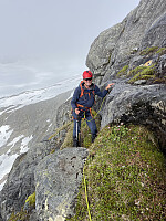 Føringstur for Svein over Austanbotntindtraversen i nydelig vær. Startet fra "vinterparkeringa" siden det var rikelig med snø på utmarsjen. Fant ut at jeg kunne ha kjørt inn og parkert i endeveien 400 meter lenger sør for vår parkering. Greit å vite til senere. Fine forhold over traversen. Vi klatret direktevarianten opp til sørtoppen i to taulengder. Litt småvått et parti, men klarte å bryte oss opp. Måtte fram med stegjerna ca. 30 meter langs en snøegg etter sørtoppen, men ellers hadde vi ikke bruk for dem.
