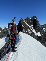 Føringstur til alle 2000-metringene på Maradalsryggen for Geir og Nina. Start fra Skagadalshytta. Fra Slingsbybreen og opp tok vi en direktevariant opp mot Nørdre Maradalstinden som vi brukte opp og ned. Ca. 40 graders snøflanke det meste av veien, men et parti med litt utsatt klyving ut mot venstre der vi brukte tausikring. Ellers var det primært bruk av tausikring to korte taulengder opp mot Sør for Sentraltinden. Greit å omgå Maradalstinden S1 i sørflanken hvis man finner enkleste vei.