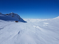 På grunn av lite snø i Øst-Jotunheimen ble vi shuttlet til Bessheim der vi kunne starte med ski på beina. Det var meldt mye vind i fjellet, så vi valgte å ikke ta turen opp på Besshøe. Ruslet først opp til Bessvatnet, videre til vestenden av denne og ellers for det meste langsmed besseggenstien videre til Memurubu. Mye avblåst, så ble en del skibæring. Det var gløtt av sol, relativt mildt, men en del vind denne dagen. En deltaker slet litt med gnagsår, men fikk ordnet >>>