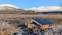 Dette var en tur jeg har tenkt på lenge. Det ble nok litt i seineste laget mtp høstfarger og varm sol. Fikk heldigvis turfølge i dag. Fikk med Morten og Terese. Terese og jeg reiste fra Gjøvik kl 05.00. Det var mørkt og kaldt...og kald skulle dagen bli til fjells også. Vi plukket opp Morten nær Beitostølen og reiste så videre over Valdresflya for å komme oss videre til startstedet som var ved parkeringsplassen inne ved Griningsdalskampen. Det går en vei fra hovedveien inn ved Nedre Sjodalsvatnet...ved Postfurua. En vanvittig flott soloppgang som farget 2000m toppene med et rått lys. Synd dette lyset bare varer i få minutter
