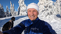 Det ble en svært krevende tur idag.. både for meg og Embla. Hun gikk mye bak meg i mine spor i dag og jeg hang ofte på stavene i de mer krevende partiene. Opptil 40-50cm pudder stedvis. Var nær ved å gi opp noen plasser, men skulle pinadø gjennomføre den planlagte turen. Hadde været vært dårlig hadde jeg nok avkorta runden. Været ble bare helt kanon. Litt vind og føyke i starten, men ble mindre etterhvert. Det ble en virkelig flott tur, men en lengre pause med mat og cola...men mange korte der jeg hang på stavene i dypsnøen.