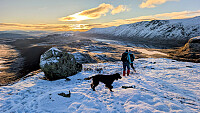 Tok en tur på Åsen for noen bratte, glatte og våte høydemetre. Møtte snøen et stykke oppe i lia og fottøyet idag var ikke av beste sorten. Men,- så innbød ikke været til noen lunch heller. Svært glatt ned "Jens Hansens sti. " Bra trening for balanse en slik tur...bratt, glatt, steinete...snø. Tur alene med Embla.