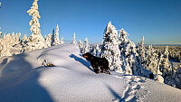 Liten tur med Roger. Lite snø. Ca 5cm nysnø på barmark og ellers greit å gå på rimelig fast snø. Sola skinte svakt igjennom skydekket og litt snødryss. Ca 3 minus.