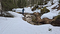 Parkerte I ei lita lomme før vannet. Herfra var det snø i veien. Satset på skitur idag. Fulgte veien langs vannet. På andre sida av vannet tok vi på skia. Men, de måtte av og på mange ganger, på grunn av bare flekker. Fant brua som var fin å krysse elva på. Utfordrende tett skog etter dette oppover lia. Ble etterhvert mer åpent, men bratt. Lenger oppe var det fint å gå på ski mot toppen.