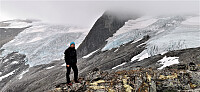 Dette er ein tur som eg kan like som aller best! Naturen er rå og mektig! Middagsnibba 1443 ligg lite inne med info om rute opp! Sett vekk ifrå at ein kan nå den fint på ski via Hanekammen 1651 moh. Ekstra kjekt då å finure terrenget som tilsynelatande ser knotete ut til fots ifrå nye kanter. Skodda låg trolsk idag med yr på toppane! Det la likevel ingen hindring på utforskningstrangen og ein eventuell retur. Nydelige haustfargar og fantastisk å studere breane & brefalla som Melkevollbreen & Briksdalsbreen/Jostedalsbreen. Ingen ting anna å seie enn stor fascinasjon for naturen i dette riket!