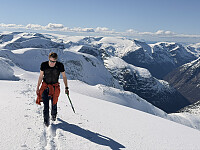 Tindefjellsryggen mellom Skålatårnet og Lodalskåpa har lenge stått høyt på ønskelista. Da muligheten endelig dukket opp, var jeg ikke vond å be. Værmeldingen kunne knapt blitt bedre, og alt lå dermed til rette for et lite våreventyr i vakre Nordfjord. Vi var fem karer i gruppa, og siden vi skulle reise fra ulike steder i landet, ble starten fra Skålatårnet parkering ganske sen. Klokken 18:30 var skiene festet på sekkene, og gjengen var klar for kveldsturen opp Norges lengste motbakke. Høydemeterne forsvant raskt på tørr og fin sti oppover lia, og da vi passerte elva Fosdøla, nærmet vi oss snøgrensa og fylte flaskene. Rundt 700 moh spente vi på oss skiene og fortsatte oppover i en vakker solnedgang som farget himmelen blodrød. I stedet for å følge sommertraséen valgte >>>