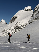 Tindefjellsryggen mellom Skålatårnet og Lodalskåpa har lenge stått høyt på ønskelista. Da muligheten endelig dukket opp, var jeg ikke vond å be. Værmeldingen kunne knapt blitt bedre, og alt lå dermed til rette for et lite våreventyr i vakre Nordfjord. Vi var fem karer i gruppa, og siden vi skulle reise fra ulike steder i landet, ble starten fra Skålatårnet parkering ganske sen. Klokken 18:30 var skiene festet på sekkene, og gjengen var klar for kveldsturen opp Norges lengste motbakke. Høydemeterne forsvant raskt på tørr og fin sti oppover lia, og da vi passerte elva Fosdøla, nærmet vi oss snøgrensa og fylte flaskene. Rundt 700 moh spente vi på oss skiene og fortsatte oppover i en vakker solnedgang som farget himmelen blodrød. I stedet for å følge sommertraséen valgte >>>