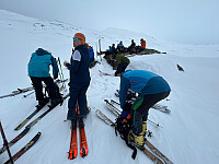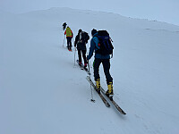 De siste 70 høydemetrene til toppen av Ruten var ganske steinete, så skiene ble parkert og vi gikk til topps med stedvis høye kneløft som ble den mest slitsomme delen av turen.