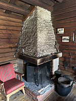 Kjørte tilbake til Tverrsjøstallen, og sørover på Sinderdalsveien. Like nord for vannet Store Sindera, har det kommet opp en ny relativt stor parkeringsplass. Parkerte her. Herfra på god sti rett sørover til man kommmer til en trebru. Rett over trebrua ligger Sinnerdammen. Fin lita hytte og veldig koselig og sjarmerende inni.
