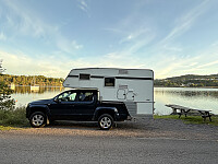 Kjørte fra Mjærskau gård på Rv 120 og videre til Fjell på Rv 155. Tok av til høyre her og kjørte Bru-Fjellveien, Bindingsveien og Rausjøveien til stor utfartsparkering i nærheten av Vangen. Parkerte ved den sørlige bommen. Gikk på vei full av holke i 250 m. Her går det av en sti til venstre, denne passerer hytta Bysætra før den fortsetter østover og direkte opp til Kjerringhøgda. Begynner å bli litt småråtten snø her, men var fortsatt såpass hardt på stien at det gikk greit. På toppen et stort fint brann/vakttårn. I motsetning til tårnet på Mjærskaukollen, så var denne helt grei å gå opp i. Men syntes det var litt bratte trinn, så jeg holdt meg godt fast både opp og ned. Litt tåkete idag, så så ikke kjempelangt. Traff også en hyggelig kar, på tur med sine >>>