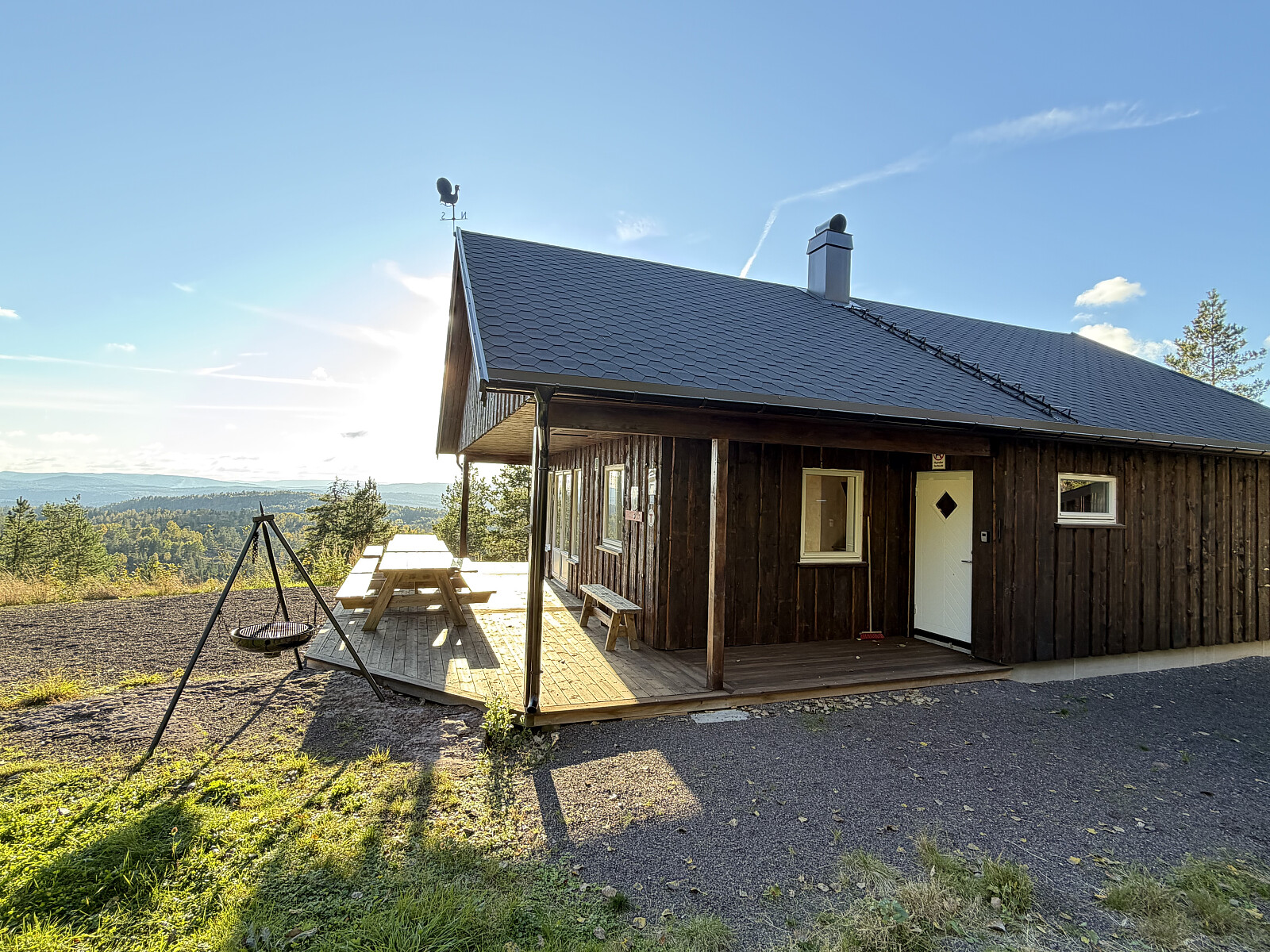 Kjørte til Høgåsveien parkering, og fortsatt videre nordover på grusvei, til et kryss rett øst om Tyristua. Herfra på beina i ca 1 km frem til Tyristua. Hytta er relativt ny, kjempefin og med en fantastisk utsikt vestover. Den er låst med spesialnøkkel, er ubetjent og har 12 sengeplasser. Fantastisk vær i dag