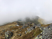 Videre vestover fra toppen ble jeg alene. Ganske tydelig sti ned mot sadelen mellom Nonshammaren og Mannen. Så på sti som etter hvert ledet opp i noen bratte partier, med stein/berg. Her valgte jeg å traversere gressflanken, noe som er helt ok.