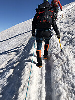 Men, morgenen var som sagt bare fin med sol og rolig start sånn i 6-tiden. Opp slalomløypa, nesten til Kleine Matterhorn,. oppe på ryggen mot Kleine Matterhorn møter vi strømmen av andre som har tatt heisen dit, på 3800 moh. Det er minst 100 stykker å se på vei mot Breithorn og flere på vei. Vi tusler avgårde i rolig tempo. Fartsøkninger merkes momentant. Men det >>>
