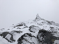 Vi sa Ha det! til de andre som startet turen mot Fondsbu, og la avgårde på snø underlag, så si hele veien til topps, nord for Olavsbunuten. Heldig var vi som hadde sporene til de som hadde vært her dagen før å gå i, for sikten var ikke mye å skryte av. Vi valgte å stikke innom "haugen" Nordvest for Mjølkedalstind, slik at Garm fikk seg en ny topp.