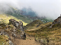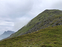 Videre vestover fra toppen ble jeg alene. Ganske tydelig sti ned mot sadelen mellom Nonshammaren og Mannen. Så på sti som etter hvert ledet opp i noen bratte partier, med stein/berg. Her valgte jeg å traversere gressflanken, noe som er helt ok.