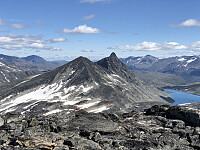 På sykkel fra Leirvassbu, langs anleggsvegen i Gravdalen. Noe før Gravdalsdammen parkerer jeg doningen. Herfra må jeg vade over Storutla. Det går helt fint. Sørvestover opp lia, mot nordsiden av Vest for Vestre Rauddalstind (1931 moh.), og etterhvert vest for liten bre. Nokså bratt men greit nok. En del sva. Siste stykket dreier jeg ut på vestryggen, før 1931 er besteget. Så bærer det ned og opp før første 2k-topp er nådd. Vestre Rauddalstinden.