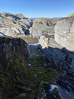 Jeg tullet litt på returen og er glad jeg hadde mitt eget GPS-spor å følge. Det viktige er å finne nedgangen markert med en liten varde på posisjon ca. 32V 369222 6639030 (UTM) og 1120 moh. Om lag 9 km og 700 hm til sammen.