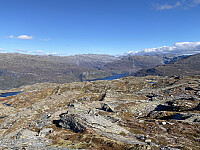 Om lag 12 km, 750 hm og 3 ¾ timer på tur i enestående høstvær. Startet (og avsluttet) nederst i Fjellkleiv på om lag 600 moh og fulgte god sti mot Oddavarden, så på dårligere tråkk ned til utløpet av Fljådalsvatnet. Herifra rundet jeg opp i dalsøkket vest for 990-toppen og tok meg videre vestover forbi tjørna med samme høydeangivelse. Etter grei kryssing av Krossdalen tok jeg kurs rett nordvest mot toppen, hvor jeg ankom etter 1 ¾ timer på tur.