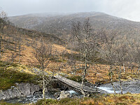 Godt eksempel på å velge tur etter værforholdene, som er god HMS! Hadde egentlig planer om å gå på Ruklenuten 1072moh ved Grostølsnuten etter finværsturen dit for to uker siden, men skodde i høyden gjorde at jeg måtte ha en plan B. Startet nederst i Fjellkleiv på om lag 600moh og tok rett over høydedraget etter å ha passert hyttene øverst. Gikk kupert, men greit ned til brua over Fljådalselva like ovenfor Tungestølen. Denne brua er gammel og den ene hovedstokken er knekt, men den holder nok noen år til.