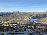 Om lag 12 km, 750 hm og 3 ¾ timer på tur i enestående høstvær. Startet (og avsluttet) nederst i Fjellkleiv på om lag 600 moh og fulgte god sti mot Oddavarden, så på dårligere tråkk ned til utløpet av Fljådalsvatnet. Herifra rundet jeg opp i dalsøkket vest for 990-toppen og tok meg videre vestover forbi tjørna med samme høydeangivelse. Etter grei kryssing av Krossdalen tok jeg kurs rett nordvest mot toppen, hvor jeg ankom etter 1 ¾ timer på tur.