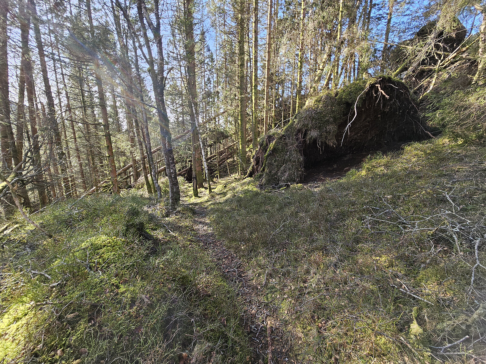 Etter turen til Orrtua kjørte jeg et lite stykke nedover fra Bontveit og parkerte ved en skogsvei. Hadde planlagt en rundtur på skogsvei på østsiden av Ulvsfjellet samt å besøke hytten Fjellro som tidligere var bedriftshytten til trelastfirmaet Namtvedt, nå privat. Oppe ved hytten var skogsveien blokkert av store graner som var rotvelt etter stormen. Jeg valgte da å gå forbi hytten og ned en gjengrodd vei på østsiden. Derfra tilbake på skogsveien jeg gikk opp.