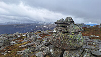 Mye høy lyng opp gjennom skogen, så greit med sti selv om den etter hvert ble temmelig gjengrodd og vanskelig å følge. Det er langt mellom merkepinnene, og hjorten har lagd stier overalt, så det er fort gjort å gå feil. Lagde meg en rundtur. En del snø i skyggesidene, og snøen var lumsk siden den er fra mars og ikke bærer. Men haren hoppet lett over og fulgte meg oppover mot første toppunktet. Der står skiltet mens høyeste ligger på kanten mot Skarvatnet.