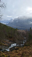 Vilt og vakkert fra Øvrebotnen til Fossedalsegga. Det regnet mer eller mindre hele turen opp til toppen, men heldigvis ikke i store mengder. Fulgte sti med rødmerkede pinner og små skilt på trærne fra Norddalsvatnet. Men som med så mange andre turstier i Bremanger er merkingen for sporadisk, og det går ikke nok folk til at stien holder seg tydelig. Gikk derfor feil et par steder, og ene gangen måtte jeg snu da jeg endte i en fjellvegg. Det er ikke mange alternative ruter der skråningen er som brattest. Oppe på første fjellplatået delte stien seg i tre ved et skilt. Jeg prøvde å følge den ene stien, men mistet merkingen og gadd ikke bruke mer energi på å holde meg på sti. Gikk i stedet etter noen hjorter jeg observerte da jeg kom over fjellkanten. Kom etter hvert inn på en >>>