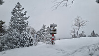 I snøværet tråkket vi oss opp til Blåfjell. Fyra i ovnen og stekte lapper på ovnen. Kosa oss i lenge i hytten her oppe i dag. Nydelig i skogen med alle trærne med snø på. Berit og Jan var med.