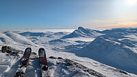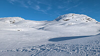 Litt mere snø nå, men fortsatt muligheter for nye riper med stein rett under overflaten. Var ferske spor opp til ryggen. Løssnø og god trening til topps derfra.