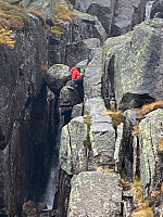 Kjørte fra Brokke mot Lysebotn og tok inn mot Langavatn like før parkeringsplassen for Kjerag. Parkerte ved bom og syklet de to første kilometrene på vei. Deretter fulgte vi merka sti til DNT-hytta Langavatn i 2 kilometer. Stien går langs vannet og er både lettgått og uten særlige høydemetre. Vi satt oss på hyttetrappa og spiste niste. Etter hytta fulgte vi merka sti et kort stykke før vi tok ut i terrenget mot Strålaus. Her ble det ganske bratt og tyngre å gå. Tåka lå nokså tett i høyden så vi fikk ikke se så mye, men kom oss opp til varden. Der blåste det kraftig så det var bare å få tatt noen bilder å snu igjen.