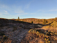 Starta å gå omtrent i det sola kom over Bjødalsfjellet for alvor. Surt vinddrag den første timen i dag, før det ble riktig deilig. Men frosten har gjort det lett å gå over myrete områder nå!