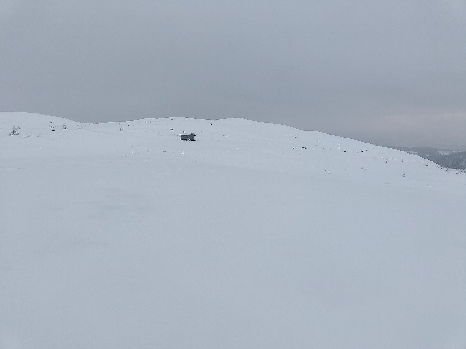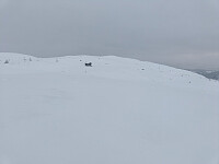 Det var fine forhold for kortfeller og fjellski i dag, med 10 cm pudder oppå en stort sett bærende skare. Litt snaut med snø der einerkrattet dominerer, så det prøvde jeg å unngå. Det var lett snø og begrenset sikt over tregrensa, så det ble som forventet en noe avkortet skitur.
