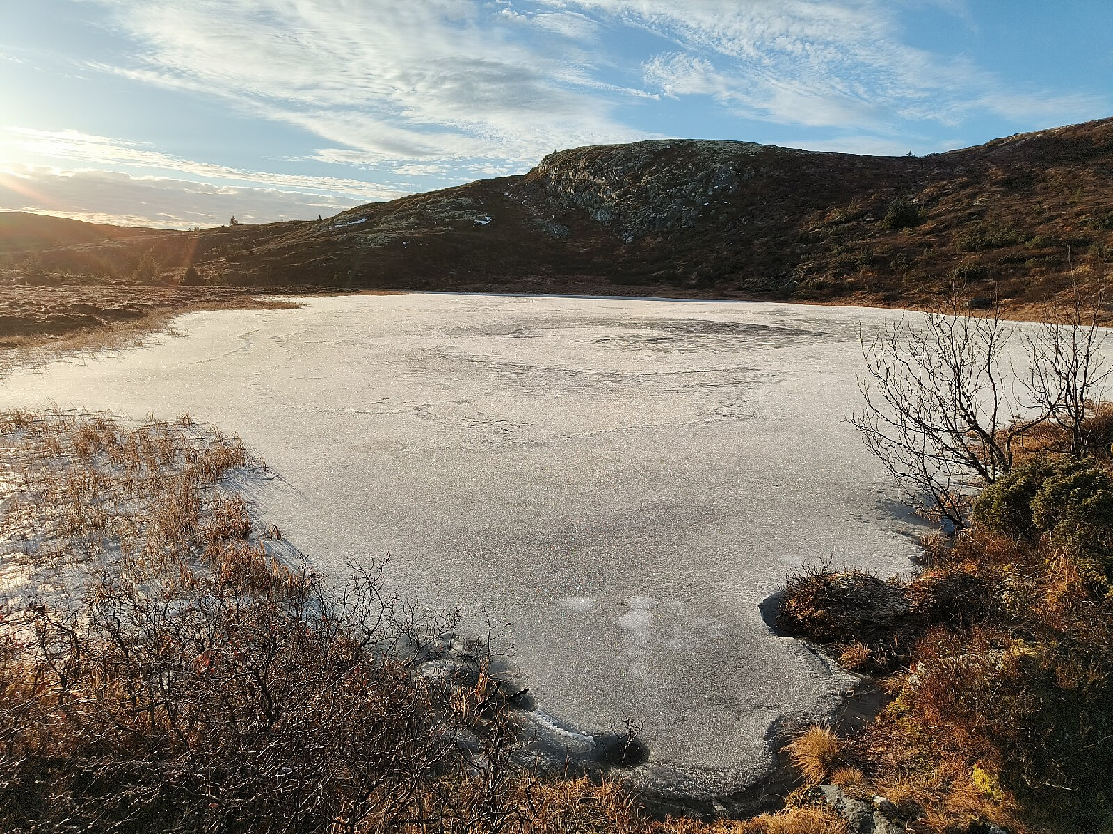 Trodde det skulle være en mer is og mindre vått, da det var så kaldt i natt. Plumpa med den ene foten oppi et myrhull jeg ikke så, men holdt meg likevel tørr på beina i dag, takket være de nyeste gode fjellstøvlene. Jeg har spart på bruken av dem i hele år.