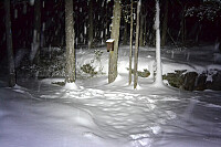 Sen kveldstur med lykt. 6 - 7 cm snø. Stjerneklart, - 14 °. Kun rev- og harespor på stien opp, samt spor av en hjort oppe ved utsikten som nokså vågalt hadde beveget seg bortetter på kanten ved stupet.