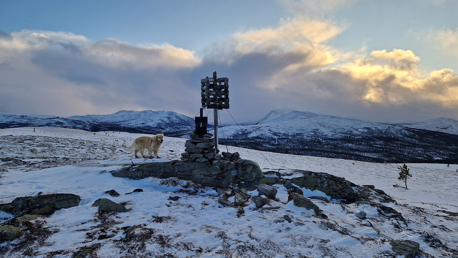 Mildt vær i dag også så da var det på med joggesko med pigg . Helt nye og annet merke enn det jeg liker best.Overraskende bra første tur.Stedvis litt isete og sporet var igjenblåst på toppen så litt tyngre å gå men super tur. Og selfølgelig fikk Aron springe løs. Herlig.