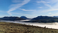 Tåke nedi bygda så det ble ganske så fint å komme opp over tåka. Fint med litt månelys og det hvite teppe over dalen. Kveldstur via Molldalsetra med Aron